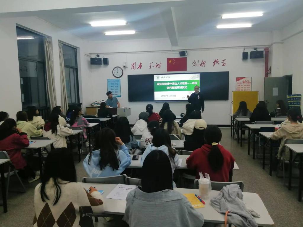 近年来,为推进涉外法治建设,培养涉外法治人才,服务国家“一带一路”倡议和云南省“面向南亚东南亚辐射中心”建设,政法学院积极作为。2023年12月1日在敏学楼1-207教室举行“政法学院涉外法治人才培养——老挝语学习班开班”,聘请普洱学院老挝留学生宋沙力为法学专业学生授课。